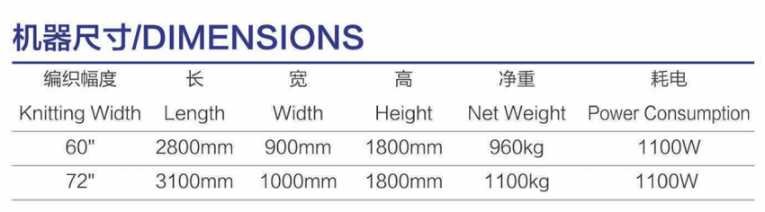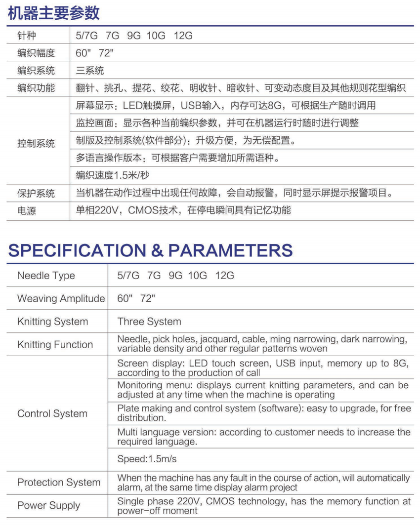 针距/Gauge: 5/7G 7G 9G 10G 12G 编织宽幅/Breadth: 60" 72"