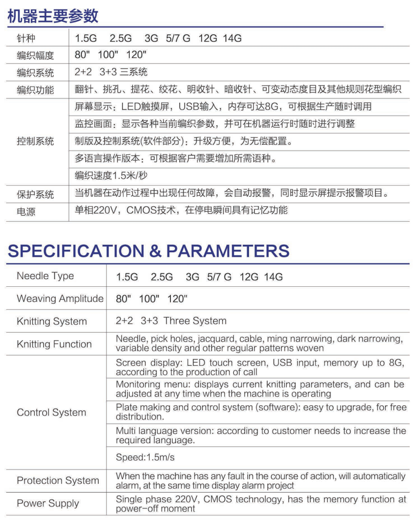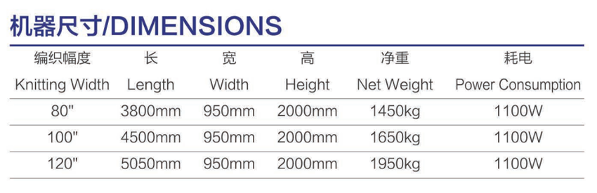 针距/Gauge:1.5G 2.5G 3G 5/7 G 12G 14G 编织宽幅/Breadth: 80” 100" 120"